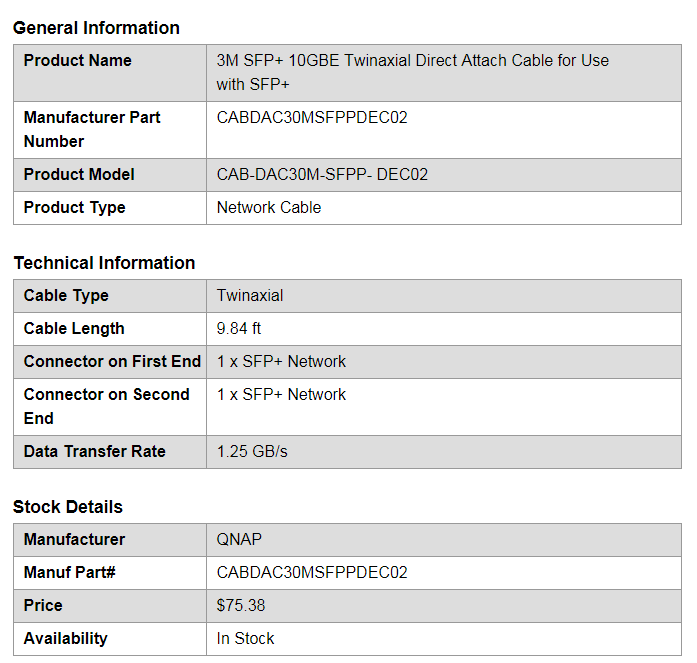 Qnap - Cab-Dac30M-Sfpp-Dec02 Sfp+ 10Gbe Twinaxial Direct Attach Cable 3.0M S/ N And Fw Update Cab-Dac30M-Sfpp-Dec02
