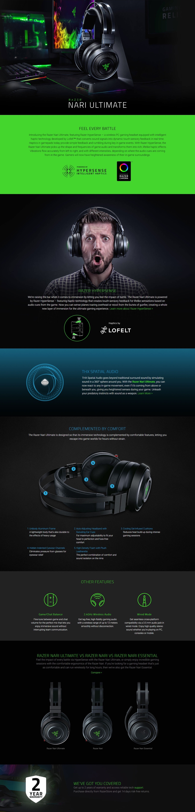 Introducing the Razer Nari Ultimate, featuring Razer HyperSense â a wireless PC gaming headset equipped with intelligent haptic technology developed by Lofelt⢠that converts sound signals into dynamic touch-sensory feedback in real time. Haptics in gamepads today provide simple feedback and rumbling during key in-game events. With Razer HyperSense, the Razer Nari Ultimate picks up the shape and frequencies of game audio and transforms them into rich, lifelike haptic effects. Vibrations flow accurately from left to right, and with different intensities, depending on where the audio cues are coming from in the game. Gamers will now have heightened awareness of their in-game surroundings.