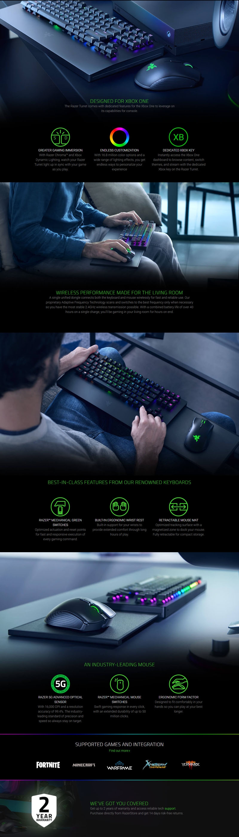 We are proud to partner with Microsoft to bring you the worldâs first wireless keyboard and mouse designed for Xbox Oneâthe Razer Turret. Equipped with our industry-leading gaming technologies, discover a new way to play in your living room