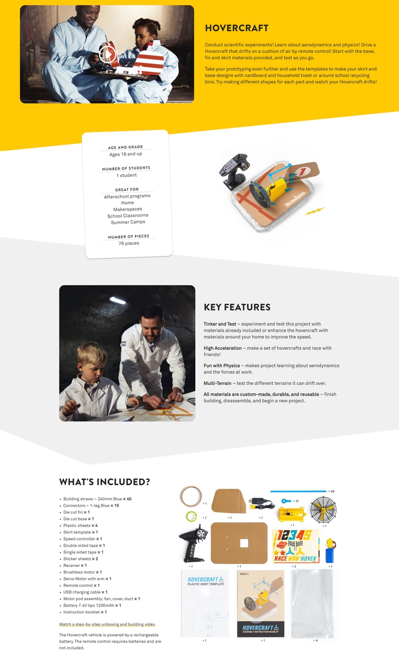 The Strawbees modular Hovercraft kit is the ultimate toy and science experience that hovers across land and sea at over 25 miles per hour (~40 km/h). Create your own spectacular design and race with your friends and family. Along with the high-tech Radio-controlled electronics, you get guidance through the STEAM curriculum guide included in the kit.