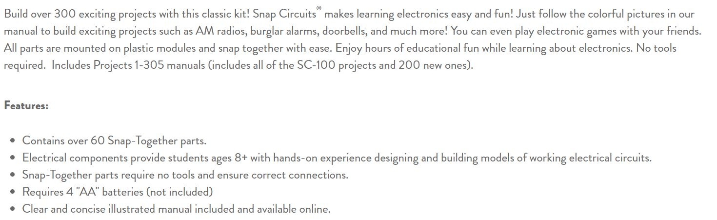Snap Circuits SC-300 Student Training Program - The Model SC-300R is an in-depth exploration of the electronic components included with the SC-300 Snap Circuits. Ideal for use in home schooling middle schools and high schools where students will grasp the basic principles of electronics. Requires four (4) "AA" batteries (Not included) Features: Same as SC-300 with the Case Student Guide and Teacher Guide Included! Topics Covered: Resistors Switches Capacitors Series Circuits Transistors Parallel Circuits Integrated Circuits Motors. Two project books Student Guide (#753289) and Teacher Guide (#753290) included. Custom Storage Case Each SC-300R comes with a lightweight durable case with custom foam inserts to store all Snap Circuits® parts. Easy to identify missing components. CI-73 Computer Interface with 73 extra projects is available for SC-300R and SC-500R only.