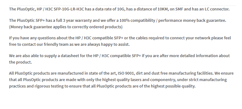 PlusOptic - Hp / H3C Compatible (Jd094B) 10G Sfp+ 10Km Fibre Optic Transceiver