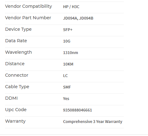HP / H3C Compatible (JD094B) 10G, SFP+, 10km, Fibre Optic Transceiver, 1310nm with LC Connector for SMF Fibre An SFP fibre optic transceiver is a device that plugs into an SFP port on your network switch and allows it to communicate via Ethernet over a fibre cable. The type of transceiver you select will vary depending on the distance and fibre cabling infrastructure you require. In addition, many switch vendors require that transceivers are âcodedâ to enable them to work. SFP+, QSFP, QSFP28 are other types of fibre optic transceiver that work at higher speeds, with specialist products available for CW and DWDM networks. Other products including XFP, FC, BIDI, Xenpak, X2, CFP etc work in a similar manner. WARRANTY 3-year manufacturer's warranty. WHY 4CABLING? Australiaâs leading importer & wholesaler of 19â server racks, copper, ethernet cable, fibre optic leads & structured networking products ISO 9001, NSW Govt. & GITC (QLD Govt.) approved supplier Secure online shopping 24/7 A loyal customer base of 100k+ who trust us for their data & electrical needs Over 3000 quality products in stock ready to go All products are approved as per local Australian standards Warranty & peace of mind return policy Lightning fast delivery nationwide Expert advice Proudly 100% Australian owned & operated
