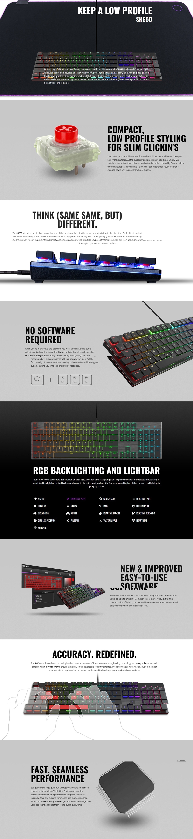 | Marketing Text | Be the envy of chiclet keyboard fanboys everywhere with the ridiculously slim SK650 Mechanical Keyboard. With extra-flat, contoured keycaps and new Cherry MX Low Profile switches in a slim, table-hugging design, you finally have a full-sized mechanical keyboard that does not stick out like a sore thumb next to your slick, all-in-one workstation. |