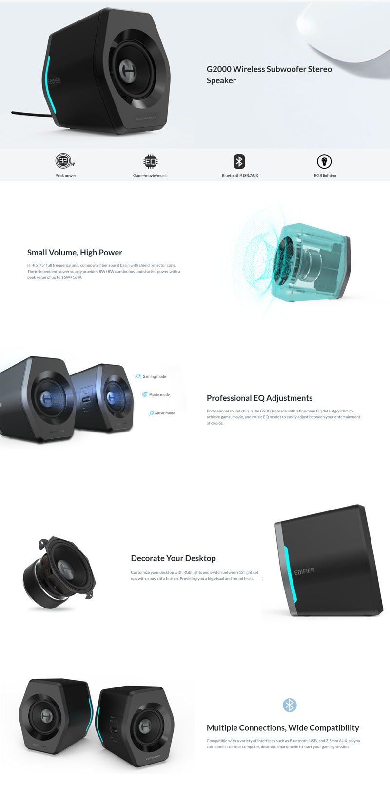 Edifier G2000 Gaming 2.0 Speakers System - Bluetooth V4.2/ USB Sound Card/ AUX Input/RGB 12 Light Effects/ 16W RMS Power
