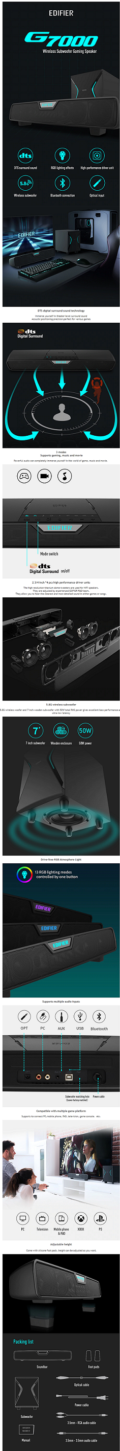 Edifier G7000 Dts Surround Sound Wireless Subwoofer Gaming Speakers -Bt/Black/Dts Surround Sound/Rgb/5.8Ghz Wireless Subwoofer/Optical Input/Gaming G7000