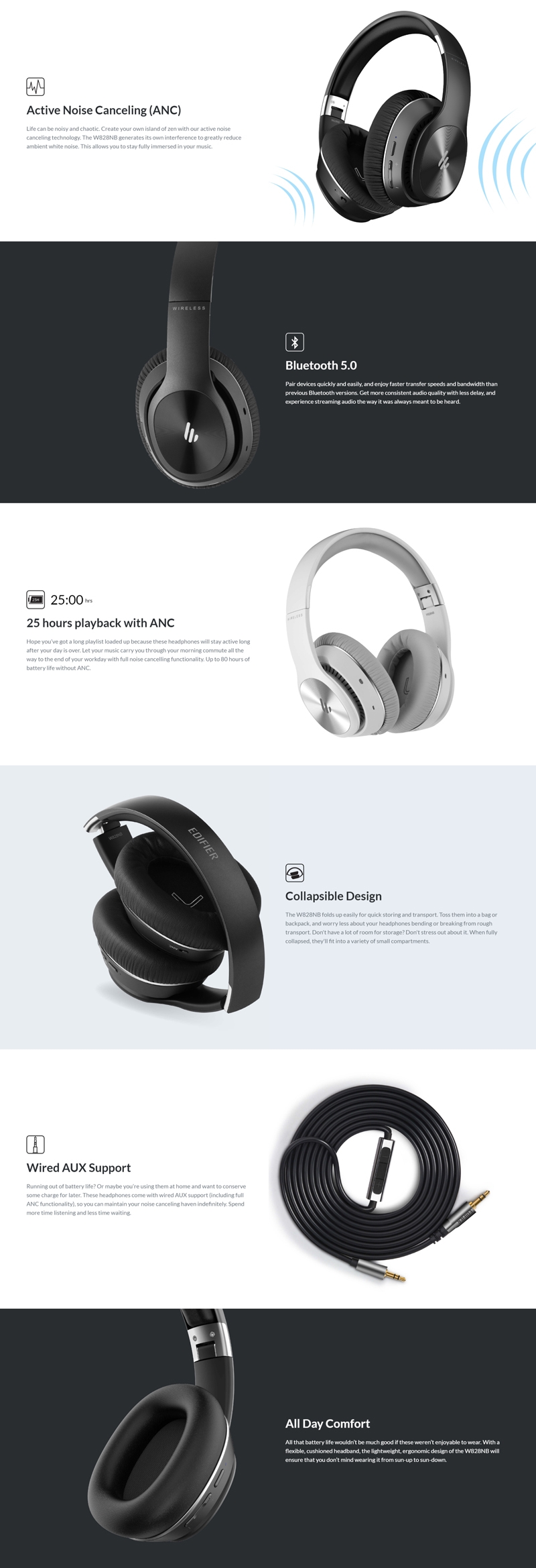 Edifier W828Nb Bluetooth 5.0 Active Noise Cancelling Reduction Foldable Hybrid Headphone - 5.0 Stereo/ Mic/ Bt/ 80Hr Battery/ 40Mm Magnetic Driver W828Nb