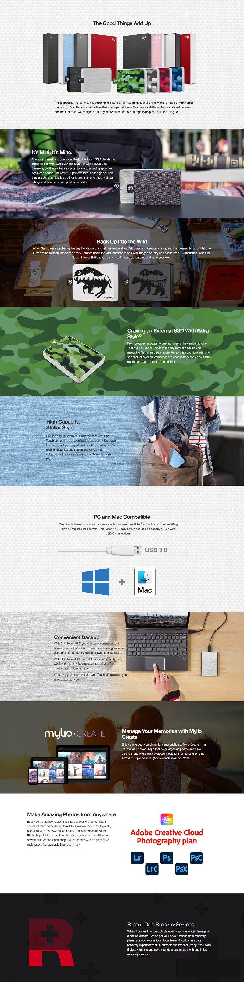CREDIT-CARD SMALL AND GREYHOUND FAST SEAGATE ONE TOUCH SSD BLENDS CHIC TEXTILE DESIGN WITH USB 3.0 TRANSFERS BACKUP FOR WINDOWS AND MAC PLUS APPS LIKE MYLIO AND ADOBE SSD TRANSFER SPEEDS UP TO 400MB/S