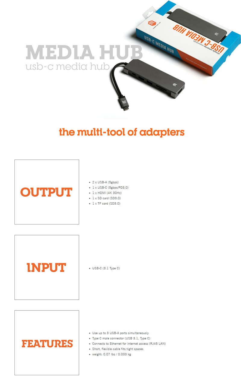 HUB MEDIA USB-C - MULTIPLE PORTS + CARD READER - GREY