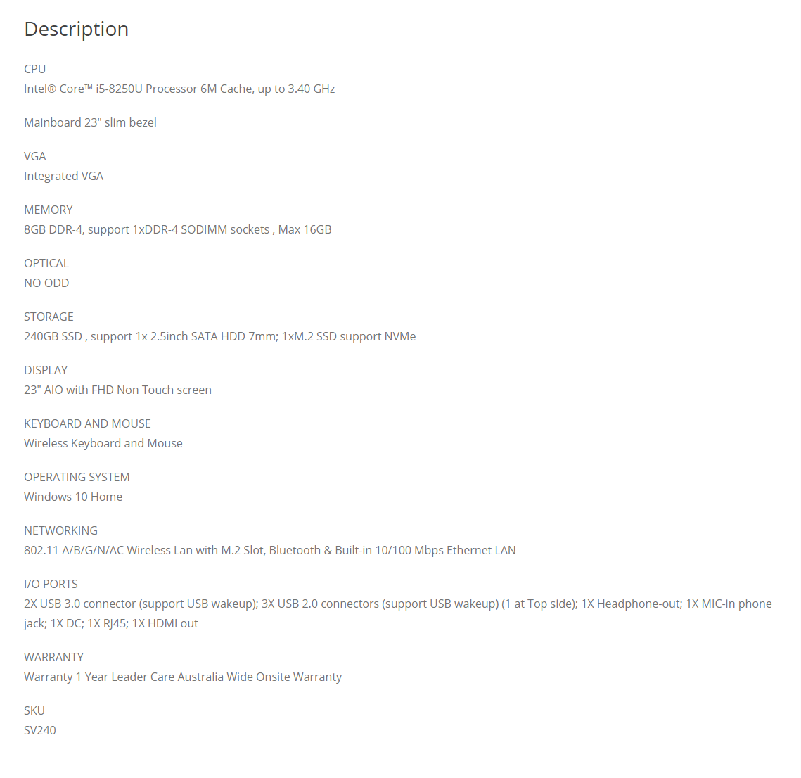 Intel I5-8250U 8Gb 500Gb Ssd Windows 10 Home 1 Year Onsite Warranty Keyboard & Mouse Thin Bezel Silver