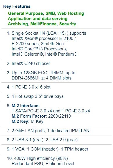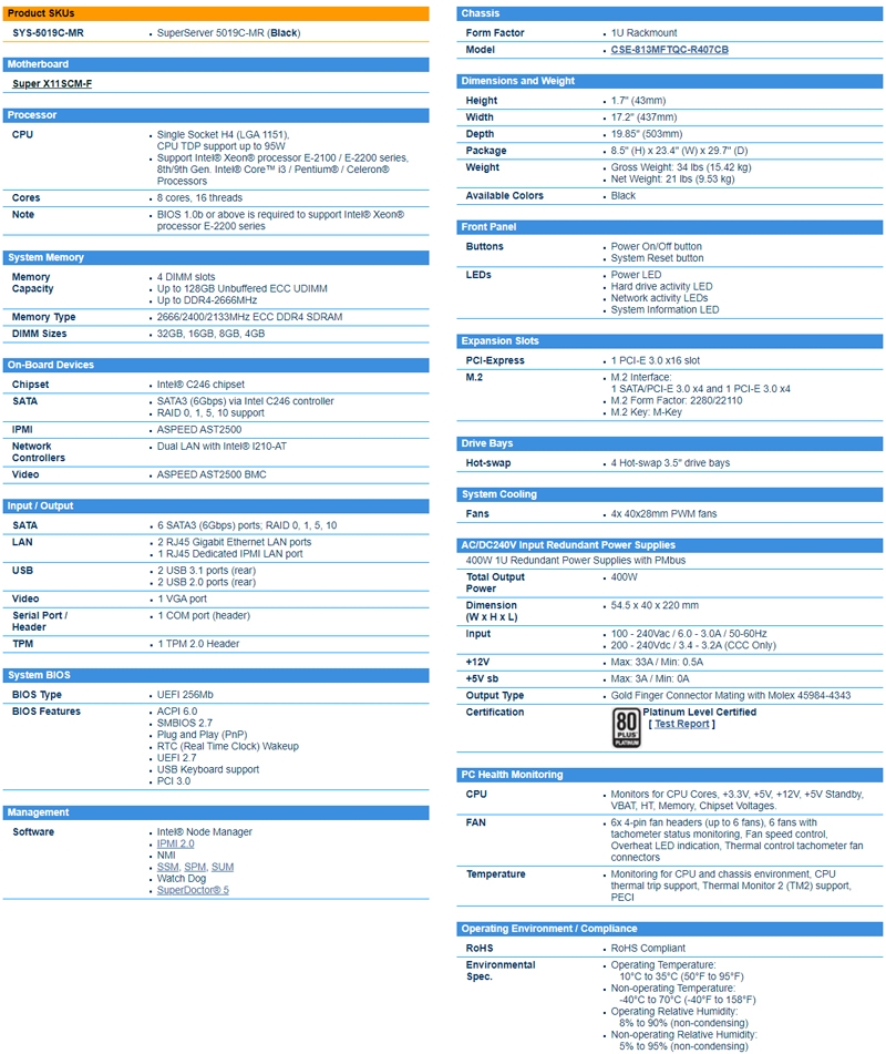 Supermicro Superserver 5019C-Mr 1U Rackmount Barebones Single Socket Lga1151 4 Dimm Slots 4 X 3.5" Hot Swap 1 X M.2 2Gbe Lan 400W Rpsu Sys-5019C-Mr