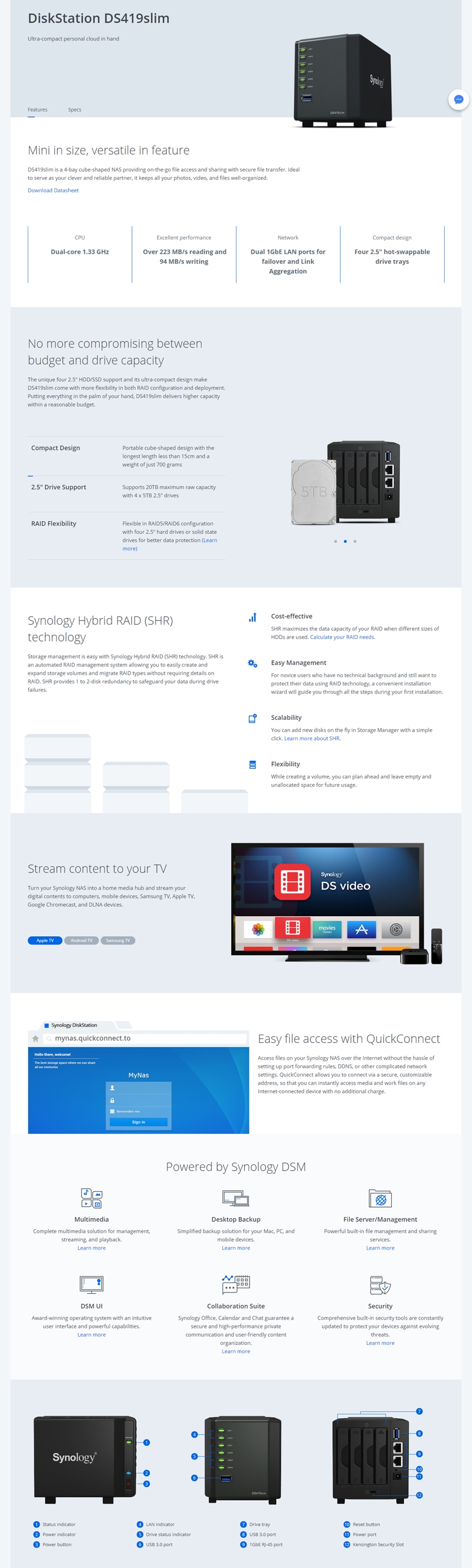 Synology® DiskStation DS419Slim, a personal cloud that provides comprehensive smart home solution. The versatile packages that come with Synology Diskstation Manager (DSM) can not only simplify file management but also stream multimedia content smoothly. DS419Slim delivers file sharing capabilities across multiple platforms while keeping files secure. DS419Slim is backed by 2 year's limited warranty.