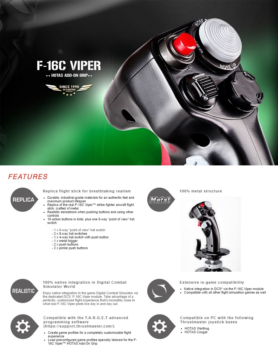 Manufacturer: Thrustmaster. This add-on for Thrustmaster Cougar & Warthog bases is a 1:1 scale replica of the F-16C Viper flight stick. It features durable, industrial-grade materials for an authentic feel and maximum product lifespan.