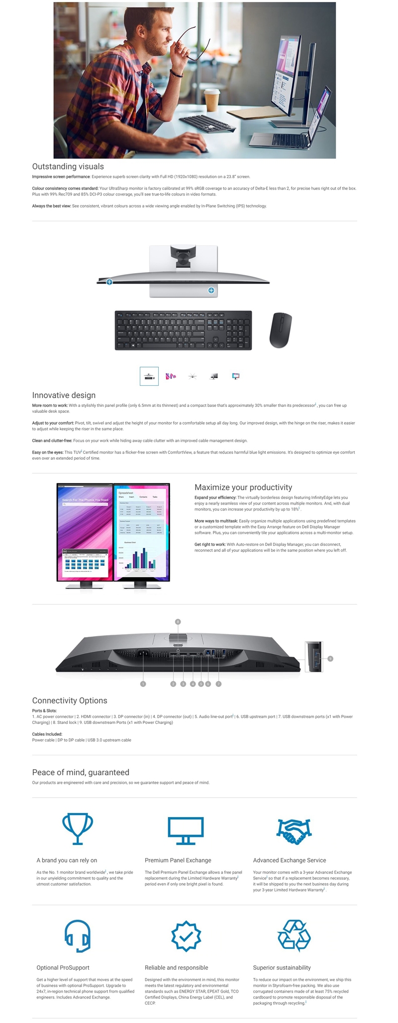 Dell U-series 23.8" (16:9) Ipsled 1920x1080 8ms Dp Hdmi Usb H/ Adj 3yr U2419h