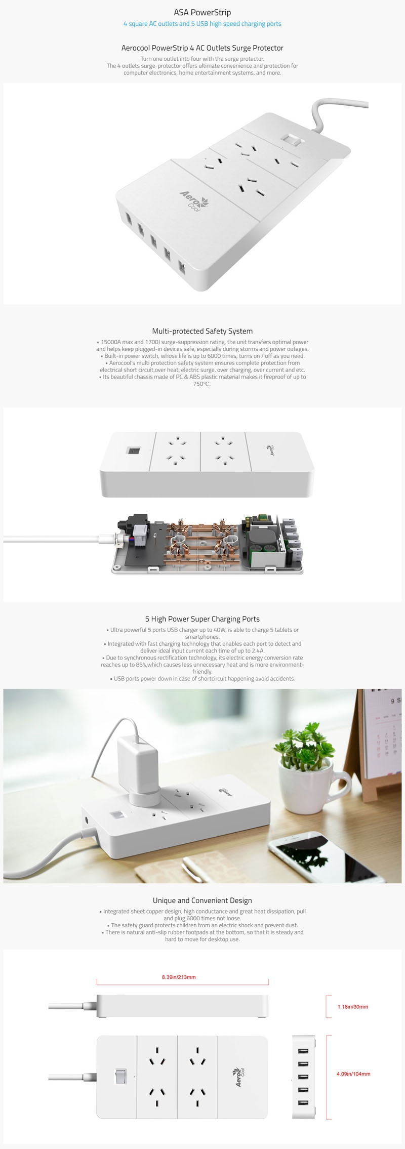 Aerocool Asa Qa4A5U2 Powerstrip W/ 4 Ac Outlet And 5 Usb Charging Ports 5V/ 2.4A Acas-Qa4A5U2-21