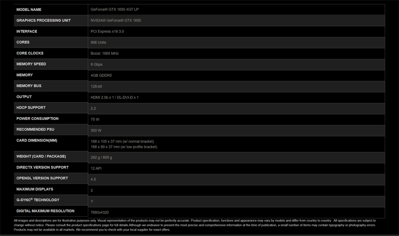 Lower Profile 4Gb 1665 Mhz/8 Gbps Gddr5 7680X4320 1Xdp1.4 1Xhdmi2.B Pci-E3.0 Opengl4.5 Directx12 Gtx 1650 4Gt Lp
