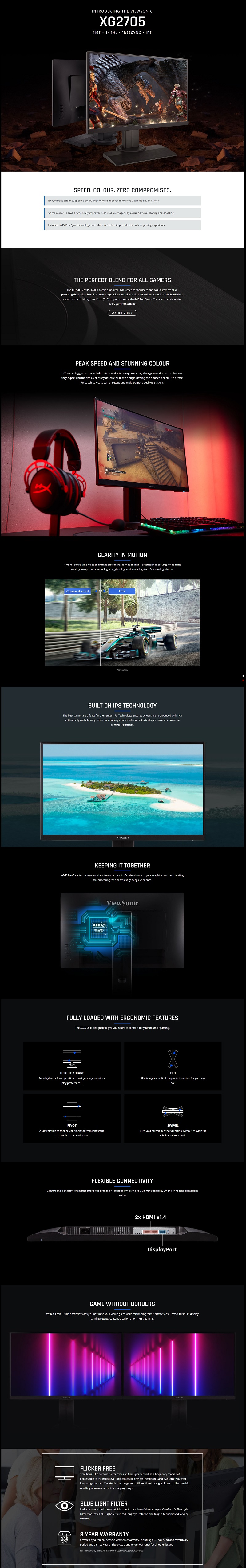 The XG2705 27” IPS 144Hz gaming monitor is designed for hardcore and casual gamers alike, providing the perfect blend of hyper-responsive control and vivid IPS colours. A sleek 3-side borderless, esports-inspired design and 1ms response time with AMD FreeSync Premium, output fluid, seamless visuals for every gaming scenario.